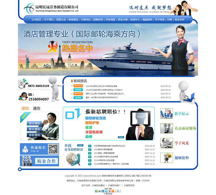 昆明宏晟勞務派遣有限公司成立于2006年,經云南省商務廳批準、國家商務部備案,榮獲《對外勞務合作經營資格證書》,并具有對外勞務合作經營資格和向境外派遣各類工作人員資質的獨立法人,同時企業(yè)還通過了中國質量認證中心IS09001:2008GB-2008質量管理體系認證和資質評審,成為中國國際商會云南分會會員單位,云南對外勞務合作協(xié)會會員。
