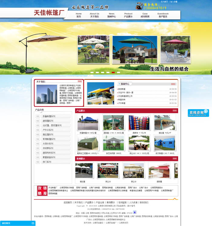 云南索樂(lè)商貿(mào)帳篷生產(chǎn)定做昆明帳篷,云南帳篷,云南昆明帳篷廠(chǎng),云南昆明戶(hù)外帳篷,昆明戶(hù)外帳篷,云南昆明折疊帳篷,昆明折疊帳篷,云南昆明救災(zāi)帳篷,昆明救災(zāi)帳篷,昆明廣告帳篷,云南廣告帳篷,昆明旅游帳篷,云南旅游帳篷,昆明廣告?zhèn)悖颇蠌V告?zhèn)?,云南昆明遮?yáng)傘等帳篷的專(zhuān)業(yè)生產(chǎn)廠(chǎng)家;云南索樂(lè)商貿(mào)有限公司旗下的天佳帳篷廠(chǎng)是一家集開(kāi)發(fā)設(shè)計(jì)、生產(chǎn)、銷(xiāo)售戶(hù)外遮陽(yáng)帳篷、活動(dòng)折疊篷、廣告帳篷、遮陽(yáng)布料的專(zhuān)業(yè)生產(chǎn)廠(chǎng)家。 經(jīng)過(guò)多年的努力開(kāi)拓、拼搏,本廠(chǎng)已擁有完備的生產(chǎn)設(shè)施和場(chǎng)地,有健全的組織機(jī)構(gòu)和雄厚的技術(shù)力量,有完善的生產(chǎn)管理和銷(xiāo)售服務(wù)系統(tǒng).產(chǎn)品銷(xiāo)售首先以云南為中心,逐步向全國(guó)輻射,良好的口碑使我們的帳篷很快就成為國(guó)內(nèi)外眾多知名品牌、企事業(yè)單位宣傳、促銷(xiāo)、廣告、慶典、休閑活動(dòng)必備器材的首選!廣泛應(yīng)用于展覽會(huì)、游樂(lè)園、別墅區(qū)、各類(lèi)高檔賓館、餐廳、酒吧、咖啡廳、公寓,休閑度假旅游區(qū),休閑廣場(chǎng),游泳池,海濱浴場(chǎng),美食街,幼兒園,學(xué)校等戶(hù)外臨時(shí)活動(dòng)以及酒店、公寓樓的陽(yáng)臺(tái)、露臺(tái)、陽(yáng)光屋等休閑場(chǎng)所。