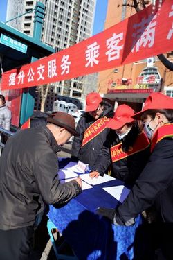 從2月21日起,首度在百貨大樓站、唐山西站、廣場站、北環(huán)樞紐站等市區(qū)客流量密集的站點(diǎn),設(shè)立咨詢臺,懸掛“提升公交服務(wù)乘客滿意度調(diào)查”條幅,工作人員頭戴小紅帽,身披綬帶,為過往乘客發(fā)放“公共交通乘客滿意度調(diào)查表”,一位乘客填完調(diào)查表后,感概的說:“這幾年咱們唐山的公交發(fā)展變化真的很大,綠色環(huán)保的空調(diào)車越來越多了,冬天不冷夏天不熱。尤其是去年的世園會夜場惠民直通車,從家門口到世園會,兩點(diǎn)一線,又惠民又方便。”許多過往的市民也在咨詢臺向工作人員主動索要調(diào)查表,大家都想為公交的發(fā)展獻(xiàn)計(jì)獻(xiàn)策。