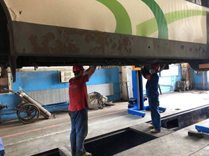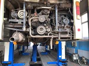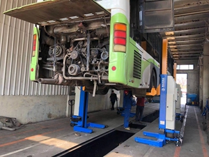 隨著新車型的疊新?lián)Q代,傳統(tǒng)的地溝舉升已不能滿足新車型的維保需求,為更安全,便捷地進(jìn)行車輛各項(xiàng)維保工作,總公司在資金緊張情況下,籌措資金,為修理公司購置4臺充電移動式重卡舉升機(jī),該移動式重卡舉升機(jī)采用無線信號連接,蓄電池供電,液壓系統(tǒng)平穩(wěn)安全舉升,不需要固定工位使用,操作人員直立地面維修,操作便捷。