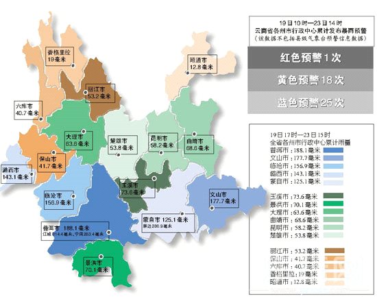 寧洱、江城、綠春、屏邊、普洱和墨江成為降雨量最大地區(qū),雨量分別為190.4毫米、182.7毫米、121.7毫米、108.7毫米、107.7毫米和105.5毫米。